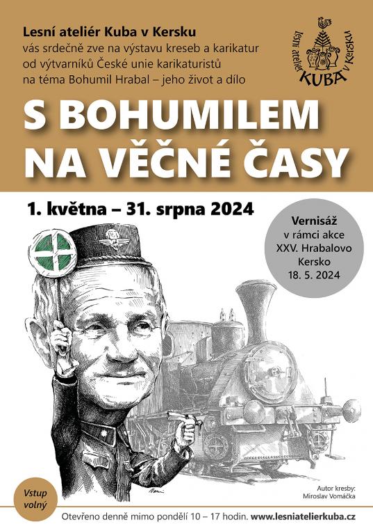01.05.2024 | Sdílet na facebookzpětLesní ateliér Kuba v Kersku vás srdečně zve na výstavu kreseb a karikatur od našich členů na téma "Bohumil Hrabal - jeho život a dílo". 1.5.-31.8.2024. - Vernisáž v rámci akce XXV. Hrabalovo Kersko se uskuteční 18.5.2024. - Více informací naleznete na plakátu.