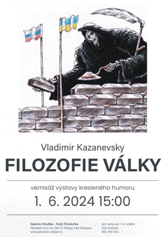29.05.2024 | Sdílet na facebookzpětV sobotu 1. 6. vás zveme v 15:00 na vernisáž do Ratají nad Sázavou. Představí se vám karikaturista Vladimir Kazanevsky svou výstavou nazvanou "Filozofie války". Všichni jste srdečně zváni, více informací naleznete v plakátu.