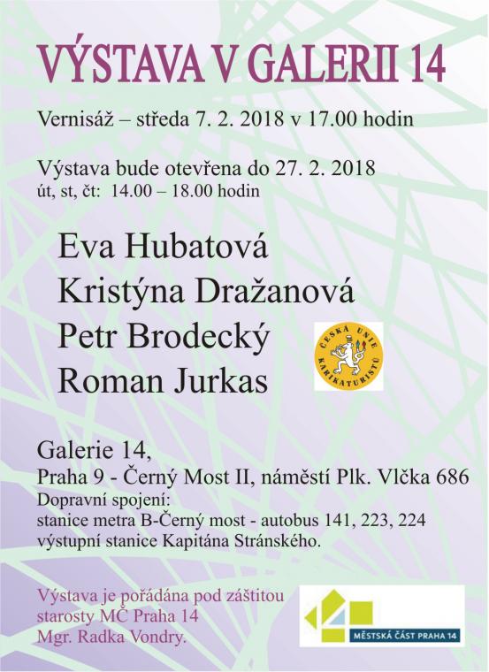 31.01.2018 | Sdílet na facebookzpětZveme Vás na výstavu do GALERIE 14, Praha 9 - Černý Most II. Vystavuje P. Brodecký a R. Jurkas, dále E. Hubatová a K. Dražanová. Vernisáž je 7. 2., a výstava potrvá do 27. 2. Více informací naleznete v pozvánce.
