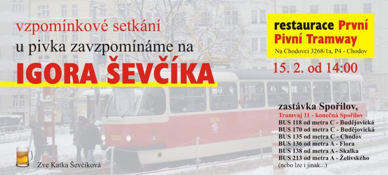 05.02.2020 | Sdílet na facebookzpět15.2., od 14 hodin, tak jako každý rok, zavzpomínáme u pivka na našeho kolegu Igora Ševčíka. Místo setkání: První pivní tramway, konečná tramvaje č. 11 a 14, Praha 4 - Spořilov. Srdečně zve Katka Ševčíková. (Podrobnosti: viz. pozvánka.)