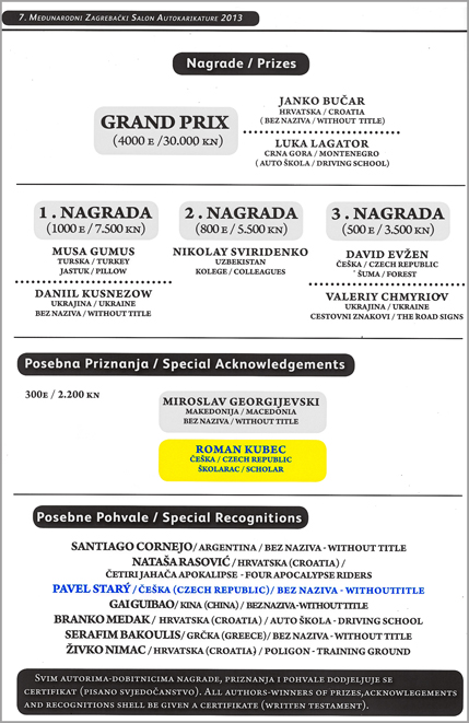 23.09.2013 | Sdílet na facebookzpětNa 7. mezinárodní výstavě a soutěži kresleného humoru v chorvatském Záhřebu letos získali ocenění hned dva autoři České unie karikaturistů. Speciální cenu sponzorovanou pojišťovnou Uniqua získal Roman Kubec, čestné uznání bylo uděleno Pavlu Starému. Výbor České unie karikaturistů oběma oceněným autorům blahopřeje a přeje do dalších soutěží skvělé nápady, pevnou ruku a hodně štěstí.