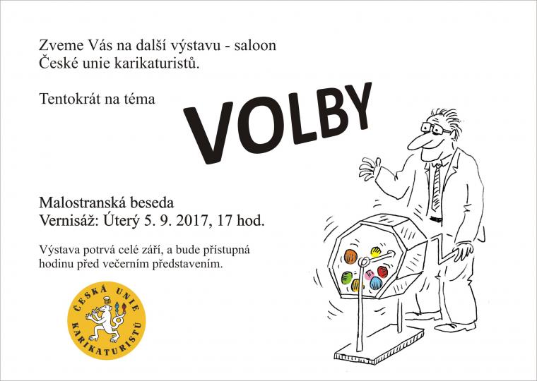 04.09.2017 | Sdílet na facebookzpětZveme Vás na další výstavu - saloon České unie karikaturistů. Tentokrát na téma VOLBY. Vernisáž je 5.9. v 17:00 v Malostranské besedě. Pozvánka je v příloze.