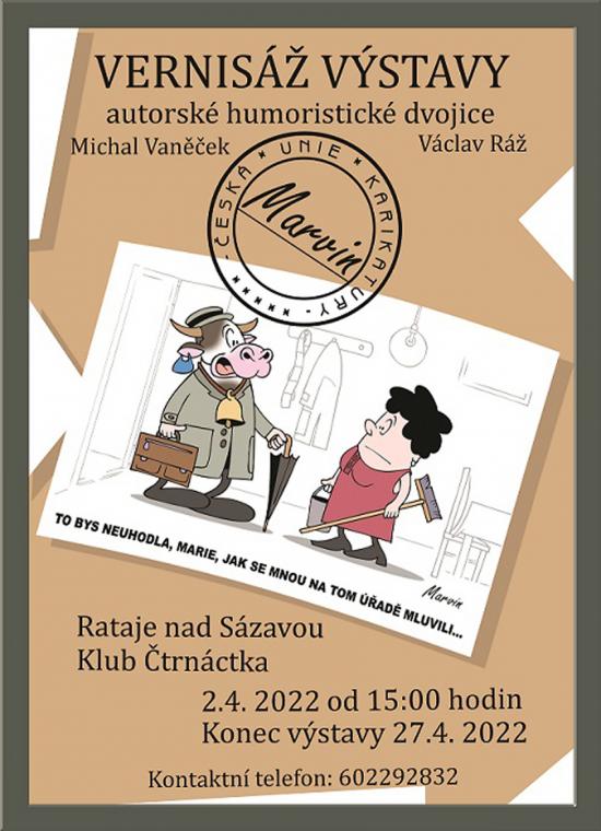 29.03.2022 | Sdílet na facebookzpětV sobotu 2.4. přijďte do Ratají nad Sázavou. Bude se zde od 15. hodin zahajovat výstava autorské dvojice Václav Ráž + Michal Vaněček - MARVIN. Podrobnosti naleznete v přiložené pozvánce. Všichni jste srdečně zváni.