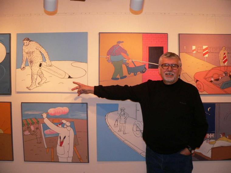 31.03.2011 | Sdílet na facebookzpět Letos jubilující Václav Linek (65), vystavuje své práce v kolínské Galerii v Zahradě, což je velmi vkusná podkrovní prostora v budově tamní lidové školy umění. Výstava s názvem LINEK – FORTE (Pilulky pro dobrou náladu) představuje průřez autorovou tvorbou, tedy práce z počátků Linkovy novinové publikační činnosti až po dnešní velkoformátové kresby, či spíše malby akrylem. Na vernisáži vzpomenuty autorovy začátky i jeho pozdější jednoznačné zařazení do skupiny kreslířů okolo Mladého světa v letech osmdesátých a devadesátých minulého století. Linkovy hutné kresby s často filozofující pointou mají svůj pevný okruh čtenářů a přiznivců, což bylo zřejmé i z početně navštívené vernisáže.