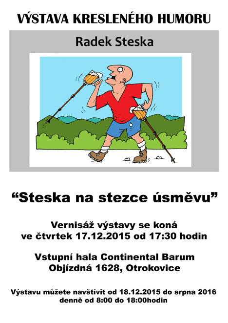 13.12.2015 | Sdílet na facebookzpět"Steska na stezce úsměvu" - to je název výstavy, jejíž vernisáž proběhne 17. 12. v 17:30 ve vstupní hale firmy Continental Barum v Otrokovicích. Autor všechny srdečně zve. Více informací najdete v přiložené pozvánce.