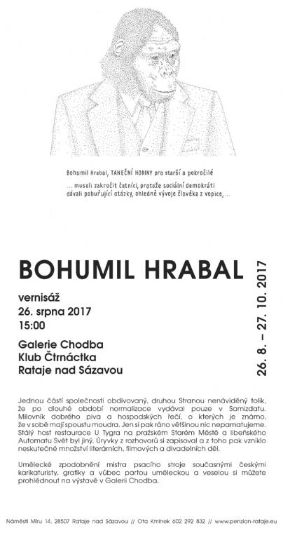 Zdravíme všechny a zveme na dlouho odkládanou výstavu s tématikou jednoho z největších spisovatelských i lidských velikánů 2. poloviny 20. století, jehož sláva nejen, že se hvězd dotýká, jak to kdysi řekla jedna paní, ale přesahuje i do století jednadvacátého, nesmazatelně zapsaána do české literatury. Ano, jde o Bohumila Hrabala. Ke zpoždění výstavy došlo z toho důvodu, že jsem v archivech hledal mistrovu alespoň malou spojitost s Ratajemi. Nenašel. Cítím to jako osobní porážku. Pokud byste někdo našel jakoukoli spojitost mistra Hrabala s Ratajemi nad Sázavou, doneste jakékoli svědectví, klidně i vymyšlené, ale musíte nás přesvědčit, že je to pravda. Nejlepší důkaz o návštěvě Mistra v Ratajích bude odměněn tiskem karikatury či grafiky s podpisem autora.