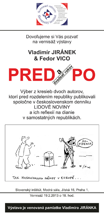 13.02.2013 | Sdílet na facebookzpětVernisáž výstavy "Pred a po" (Vladimír Jiránek a Fedor Vico) se uskuteční 19.2. v 18.00 hodin. Slovenský institut, Jilská 16, Praha 1. Vstup je volný. Vše ostatní najdete v přiložené pozvánce.