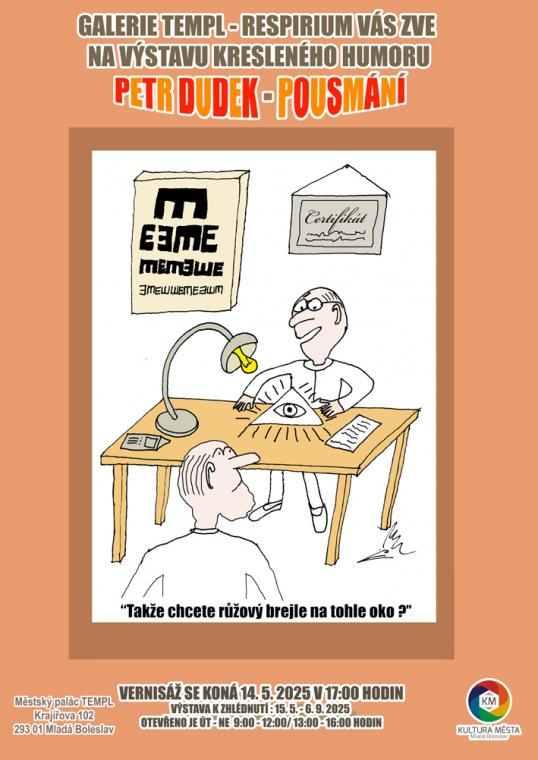 14.5. bude v Mladé Boleslavi, v galerii TEMPL, vernisáž výstavy Petra Dudka, s názvem POUSMÁNÍ. Od 17 hodin. Autor se na vás těší, a více informací naleznete na přiloženém plakátu.