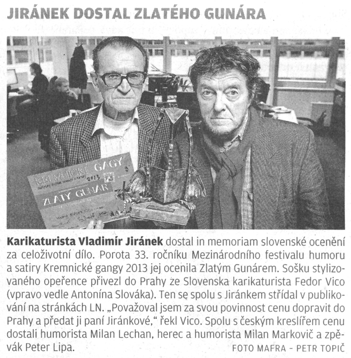 11.12.2013 | Sdílet na facebookzpětVladimír Jiránek získal cenu za celoživotní dílo, in memoriam. Stalo se na mezinárodním bienále "Kremnické gagy 2013". Vyšel o tom článek v Lidových novinách, ve středu 11. 12. 2013 - viz. příloha.