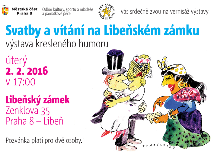 28.01.2016 | Sdílet na facebookzpětV úterý 2.2. v 17. hod. vás zveme na vernisáž výstavy členů ČUK do Libeňského zámečku, na Praze 8. Téma je příhodné pro toto místo - "Svatby a vítání (občánků) na Libeňském zámku". Těšíme se na vás. - Více informací naleznete v přiložené pozvánce.