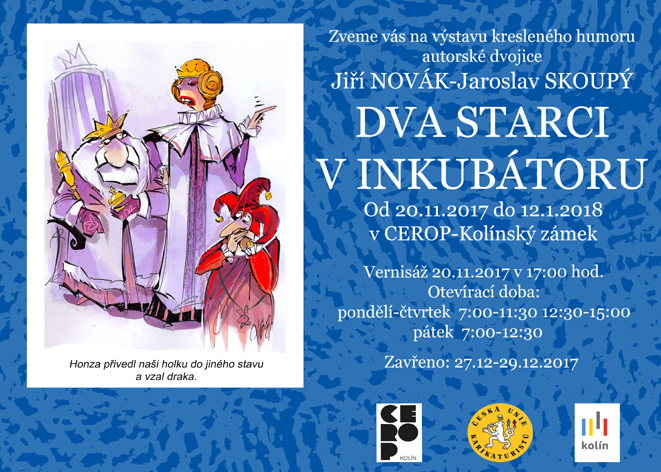 17.11.2017 | Sdílet na facebookzpětDne 20.11. vás zveme na vernisáž výstavy autorské dvojice NOS (Jiří Novák - Jaroslav Skoupý). Výstava se jmenuje "Dva starci v inkubátoru" a koná se v galerii Cerop, v Kolínském zámku. Vernisáž začíná v 17:00 a další podrobnosti naleznete v přiložené pozvánce.