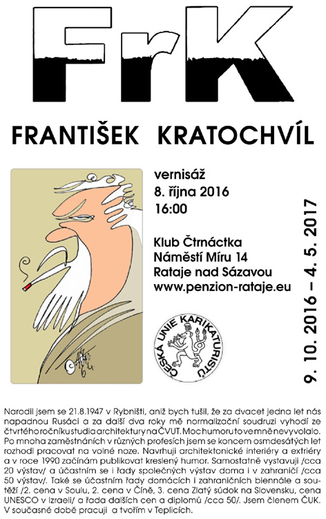 29.09.2016 | Sdílet na facebookzpětV Ratajích nad Sázavou, v klubu "Čtrnáctka", se v sobotu 8. 10. v 16:00 uskuteční vernisáž výstavy Františka Kratochvíla. Výstava by tu měla být až do 4. 5. 2017 ! Více informací naleznete v pozvánce.