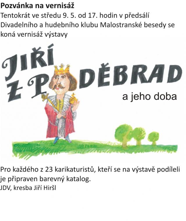Ve středu 9.5. v 17 hod. se v Malostranské besedě koná společná výstava členů ČUK - "Jiří z Poděbrad a jeho doba". Všichni jste srdečně zváni. Pozvánka je v příloze.