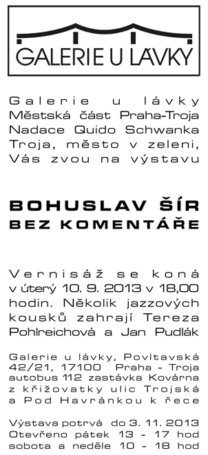 10.9. v 18:00 se koná vernisáž výstavy Bohuslava Šíra, nazvaná "Bez komentáře". Místo děje: Galerie u lávky, Praha 7 - Troja. Více informací naleznete v pozvánce.