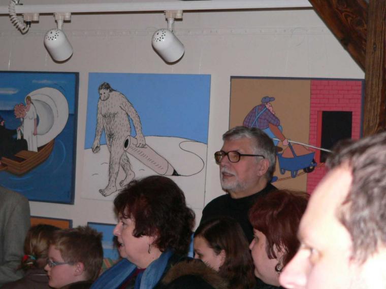 31.03.2011 | Sdílet na facebookzpět Letos jubilující Václav Linek (65), vystavuje své práce v kolínské Galerii v Zahradě, což je velmi vkusná podkrovní prostora v budově tamní lidové školy umění. Výstava s názvem LINEK – FORTE (Pilulky pro dobrou náladu) představuje průřez autorovou tvorbou, tedy práce z počátků Linkovy novinové publikační činnosti až po dnešní velkoformátové kresby, či spíše malby akrylem. Na vernisáži vzpomenuty autorovy začátky i jeho pozdější jednoznačné zařazení do skupiny kreslířů okolo Mladého světa v letech osmdesátých a devadesátých minulého století. Linkovy hutné kresby s často filozofující pointou mají svůj pevný okruh čtenářů a přiznivců, což bylo zřejmé i z početně navštívené vernisáže.