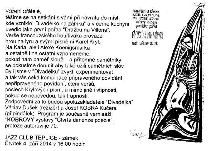 02.09.2014 | Sdílet na facebookzpětVe čtvrtek 4.9. v 16:00 vás zve Josef KOBRA Kučera na vernisáž svojí další teplické výstavy. Jmenuje se "Čtvrtá dimenze poezie", a JKK se na Vás těší v "Jazz clubu Teplice", na zámku. Více informací naleznete v pozvánce.